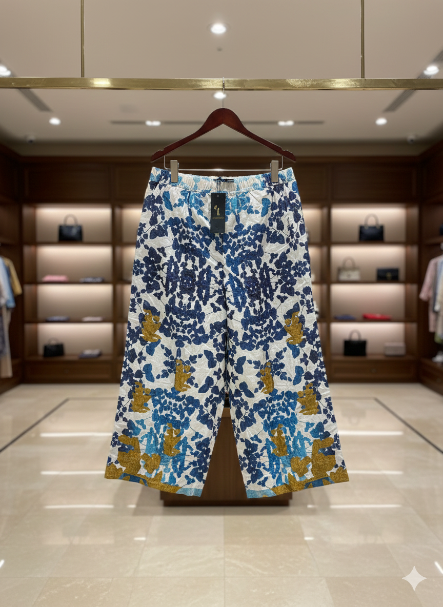 Make a vibrant style statement with these eye-catching trousers by J. (Junaid Jamshed). Featuring a bold, artistic print, the design showcases abstract botanical motifs in deep cobalt blue and rich mustard gold set against a crisp white background. The silhouette is modern and breezy, boasting a wide-leg cut (culotte style) that ensures maximum airflow and movement. Finished with a comfortable elasticated waistband, these trousers are the perfect blend of contemporary fashion and everyday ease.