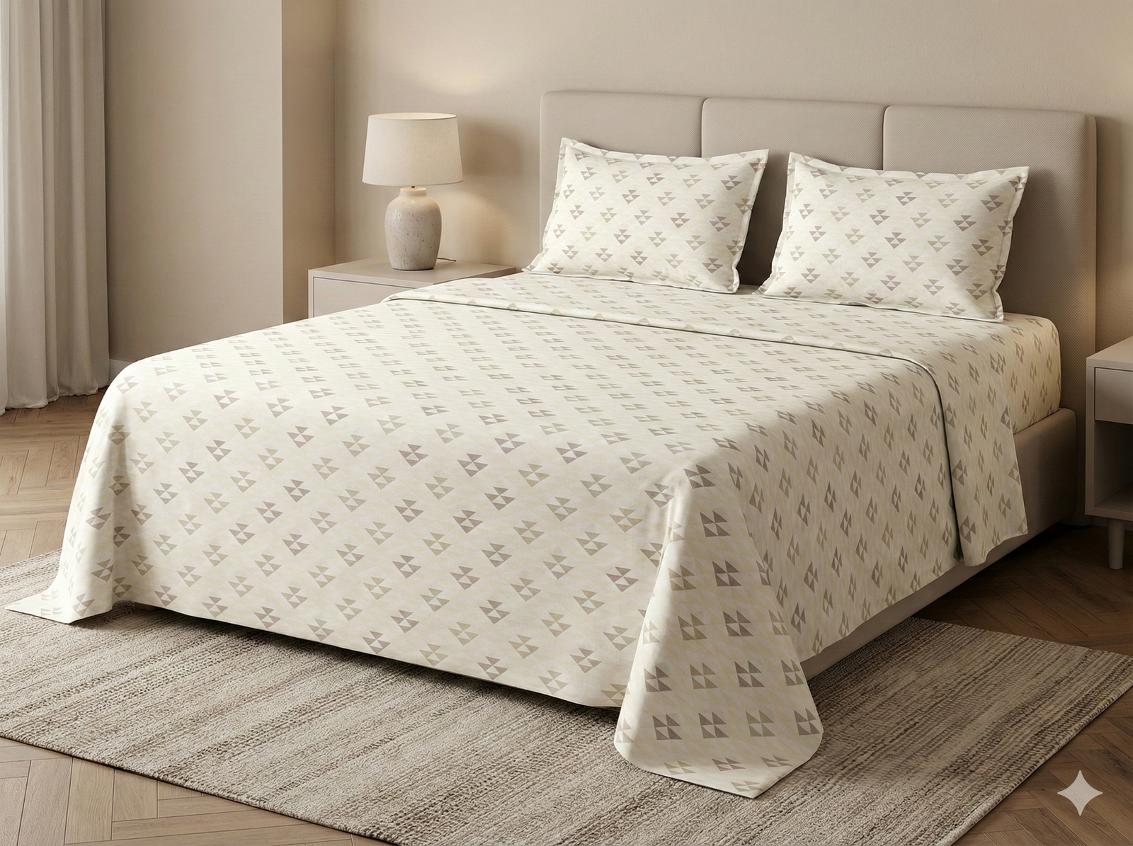 Bring a sense of modern structure and calm to your bedroom with this premium king-size bedsheet set from Ideas Home. Featuring a sophisticated neutral palette, this set showcases a refined geometric pattern of interlocking triangles that creates a subtle mosaic effect. Designed for those who appreciate contemporary minimalism, it provides an effortlessly polished look for any master suite.