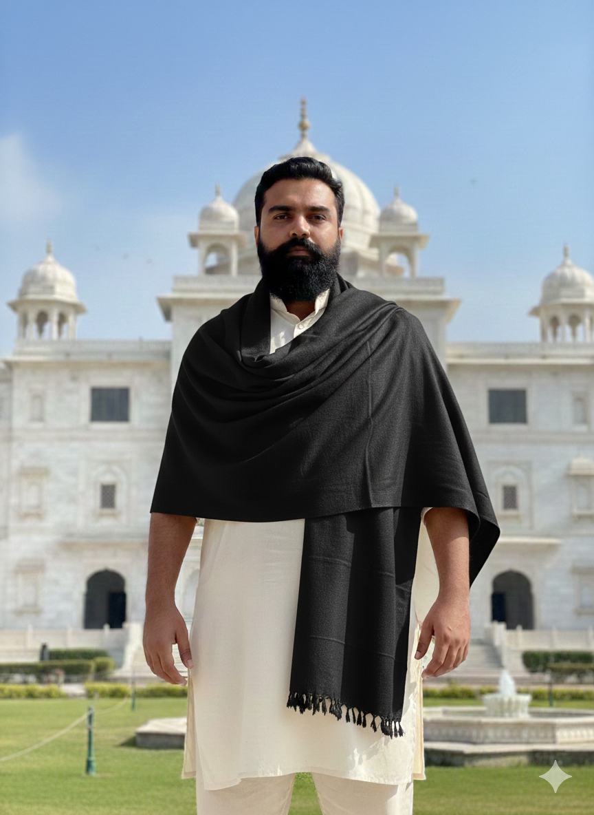 Define your winter presence with this commanding jet-black shawl. A definitive staple for the modern gentleman, it is crafted from a premium wool blend that offers both superior warmth and a refined, heavy drape. The design is intentionally minimalist, featuring a rich, solid black field that exudes sophistication, finished with classic knotted fringes at the hem for a traditional touch.