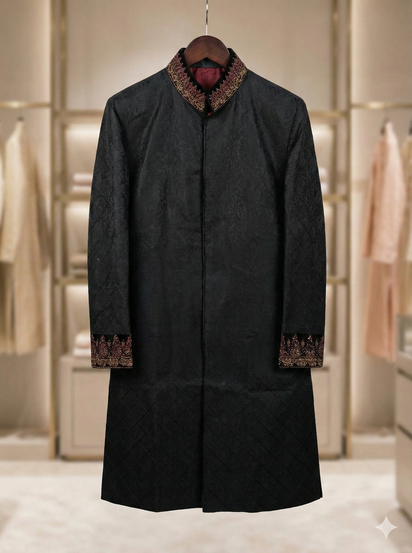 Neckline: Mandarin collar (Sherwani style).