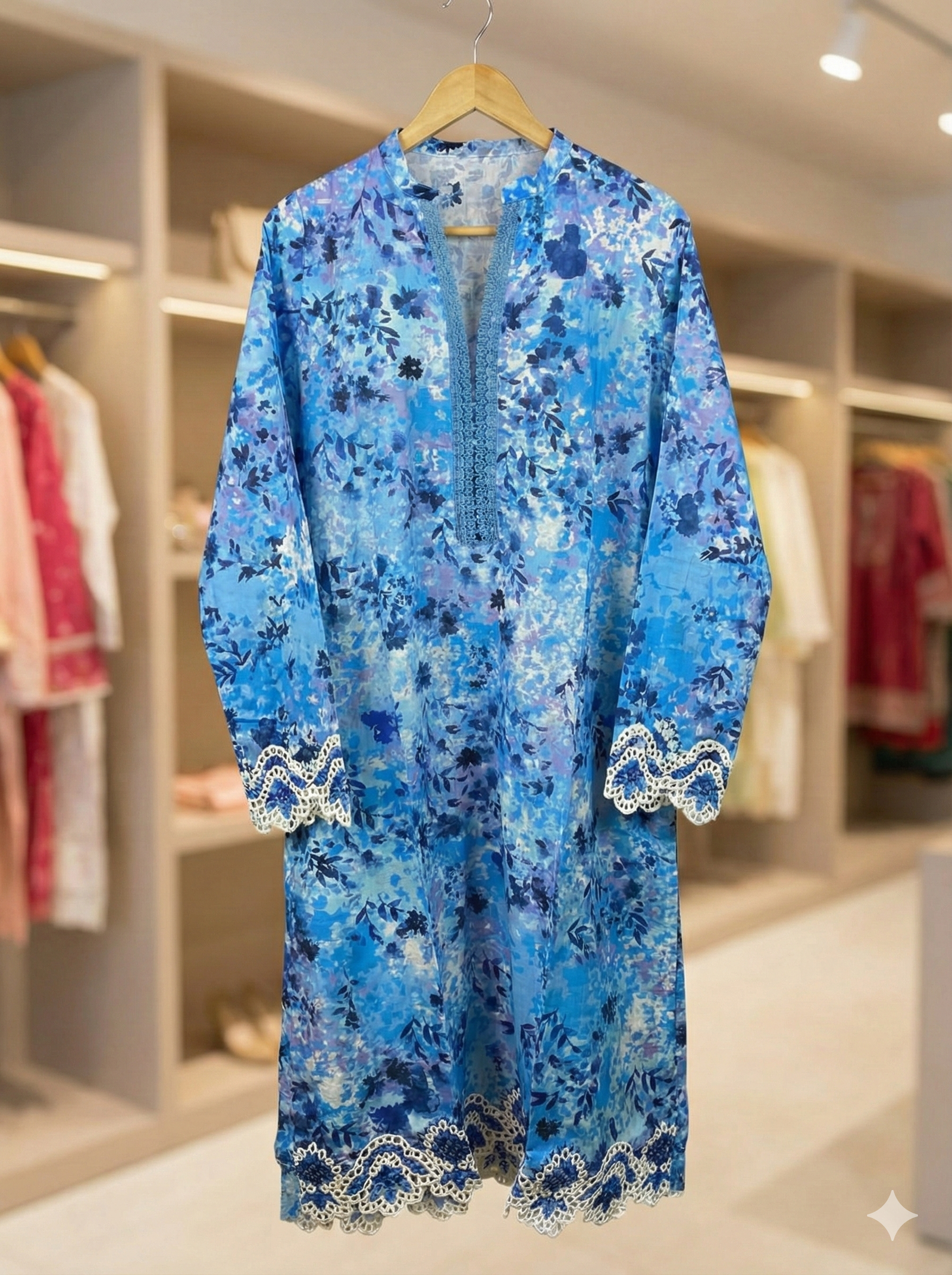 Key Detail: Delicate white embroidered borders on sleeves and hem.