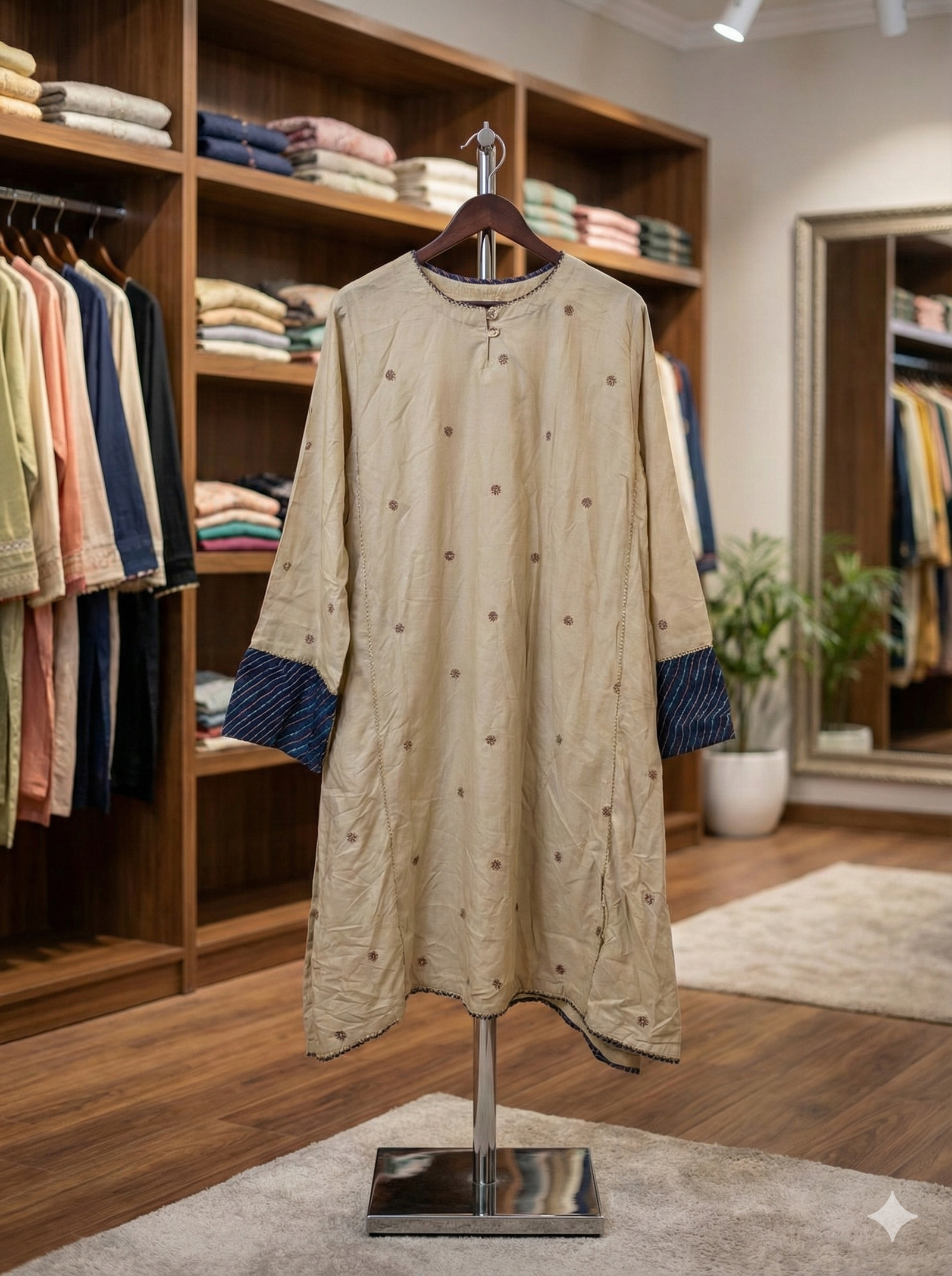 Discover the beauty of understated elegance with this sophisticated 1-piece kurti from J. The shirt features a soft beige/fawn canvas adorned with delicate, scattered floral motifs in earthy brown tones, creating a clean and minimalist aesthetic. The design is expertly elevated by striking navy blue cuffs featuring a diagonal striped pattern, which adds a bold, modern contrast to the neutral base. Finished with a classic round neckline and button detailing, this piece is a versatile staple perfect for office wear or casual outings.