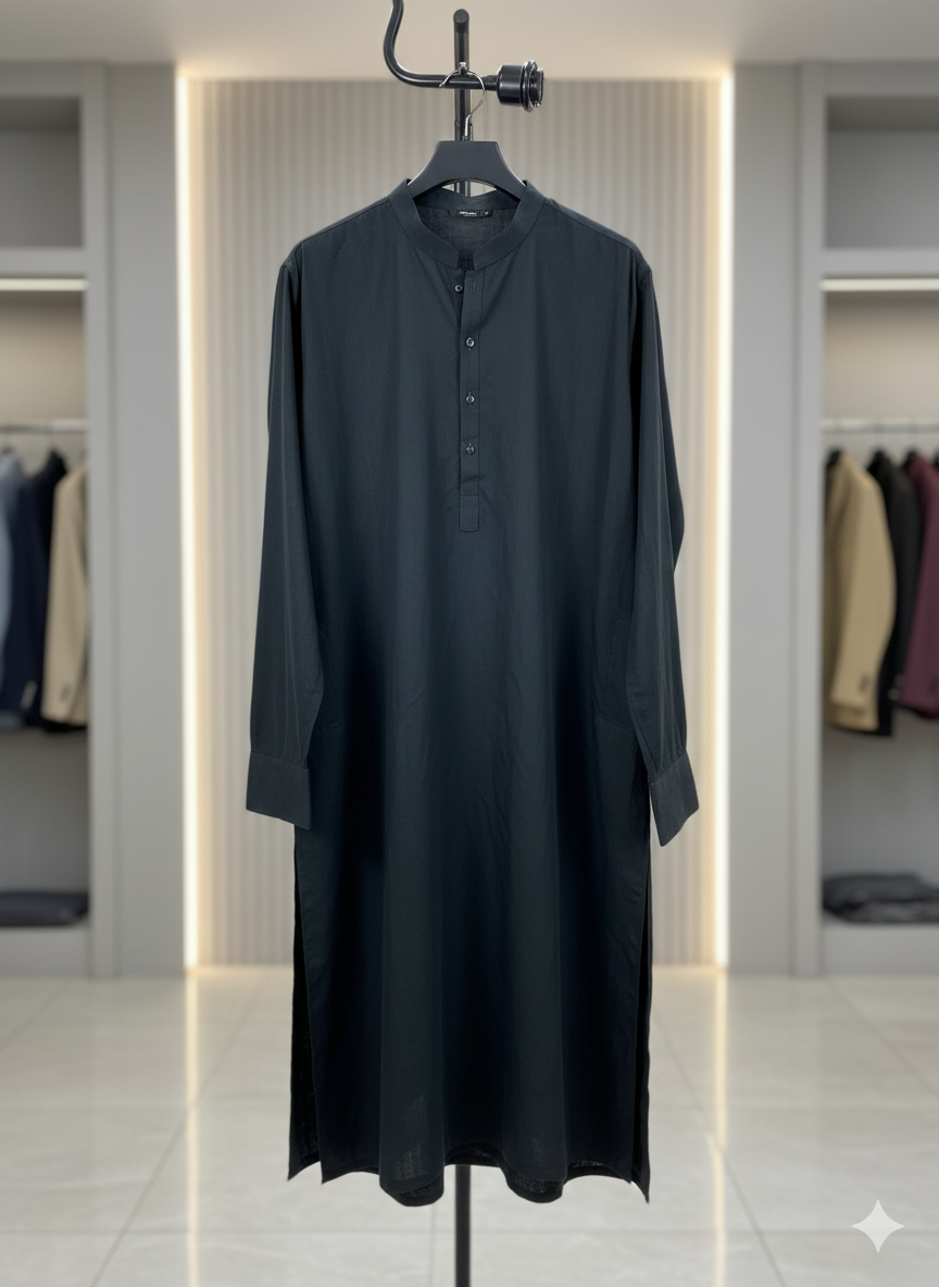 Define your wardrobe with the ultimate staple of sophistication: the classic black kameez by J. Men. This 1-piece garment is a masterclass in minimalism, featuring a deep, jet-black hue that exudes authority and timeless elegance. The design prioritizes clean lines with a sharp mandarin collar and a visible button placket adorned with matching dark buttons for a seamless look. Finished with structured, shirt-style cuffs, this piece offers a polished silhouette that transitions effortlessly from the office to evening prayers and formal gatherings.